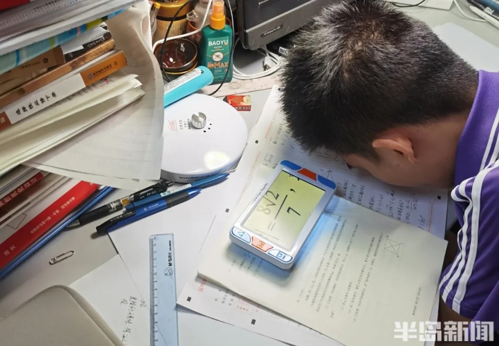 由于视力条件限制,“听”始终贯穿他的学习。2022年,伍思宇正式开始上高一,脸贴在书本上才能看清字,更别提黑板上的文字了。后来,伍思宇用上了助视器,总归还是比较吃力,学习的难度可想而知,也意味着要比别人更努力。