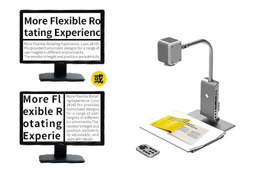 助视器配备了一款可360°灵活旋转的远近两用摄像头,低视力人士可在看近、看远之间轻松切换,尤其适合有视力障碍的学生、成年人等使用,比如低视力学生在教室上课看黑板看书,职场工作者在会议室、多功能厅看投影仪、大屏幕等。